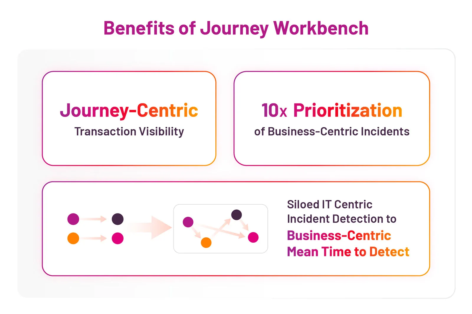 In early deployments across customer environments, Journey Workbench (JWB) has proven critical for organizations managing high transaction volumes—up to 5,000 TPS and 30TB of daily data. With the JWB implementation, these organizations achieve comprehensive, end-to-end observability, delivering targeted insights and measurable improvements in operations. Here’s how :