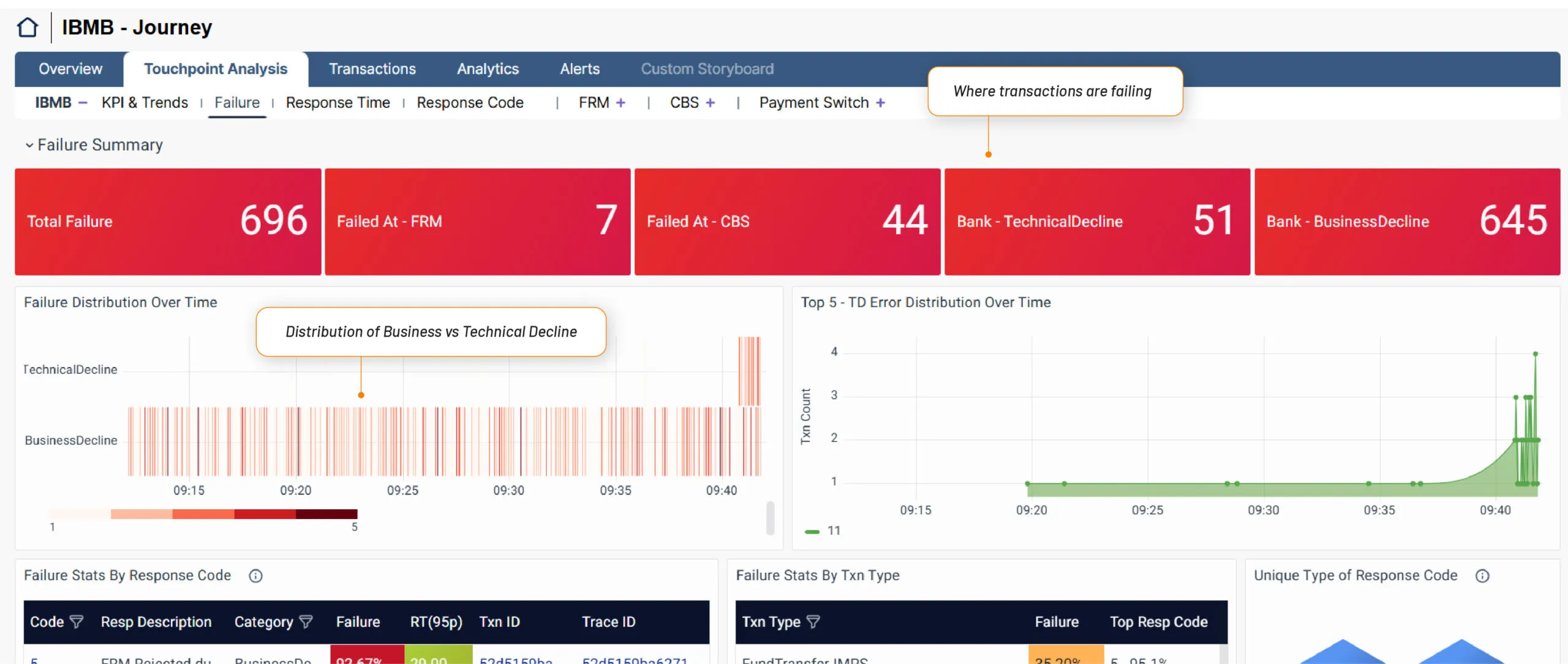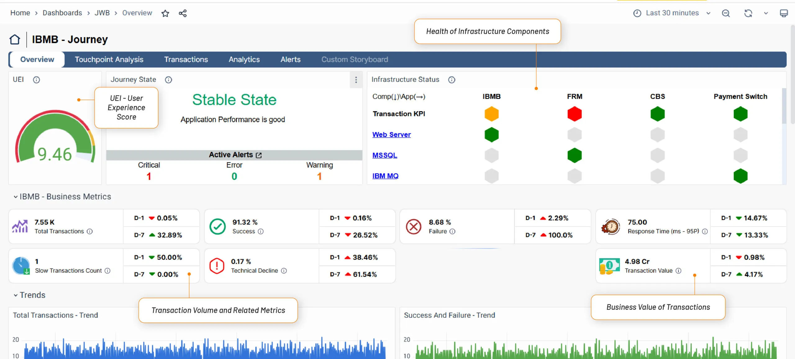 - Targeted Monitoring for Cross-Functional Teams:Multiple teams across IT, SREs, relationship managers, CXOs, and support teams, are offered tailored insights relevant to that persona. CXOs gain visibility into real-time revenue impacts on transactions, with the potential to reduce revenue leakage. IT teams can address technical issues 10x faster with business-prioritized alerts and actionable insights.