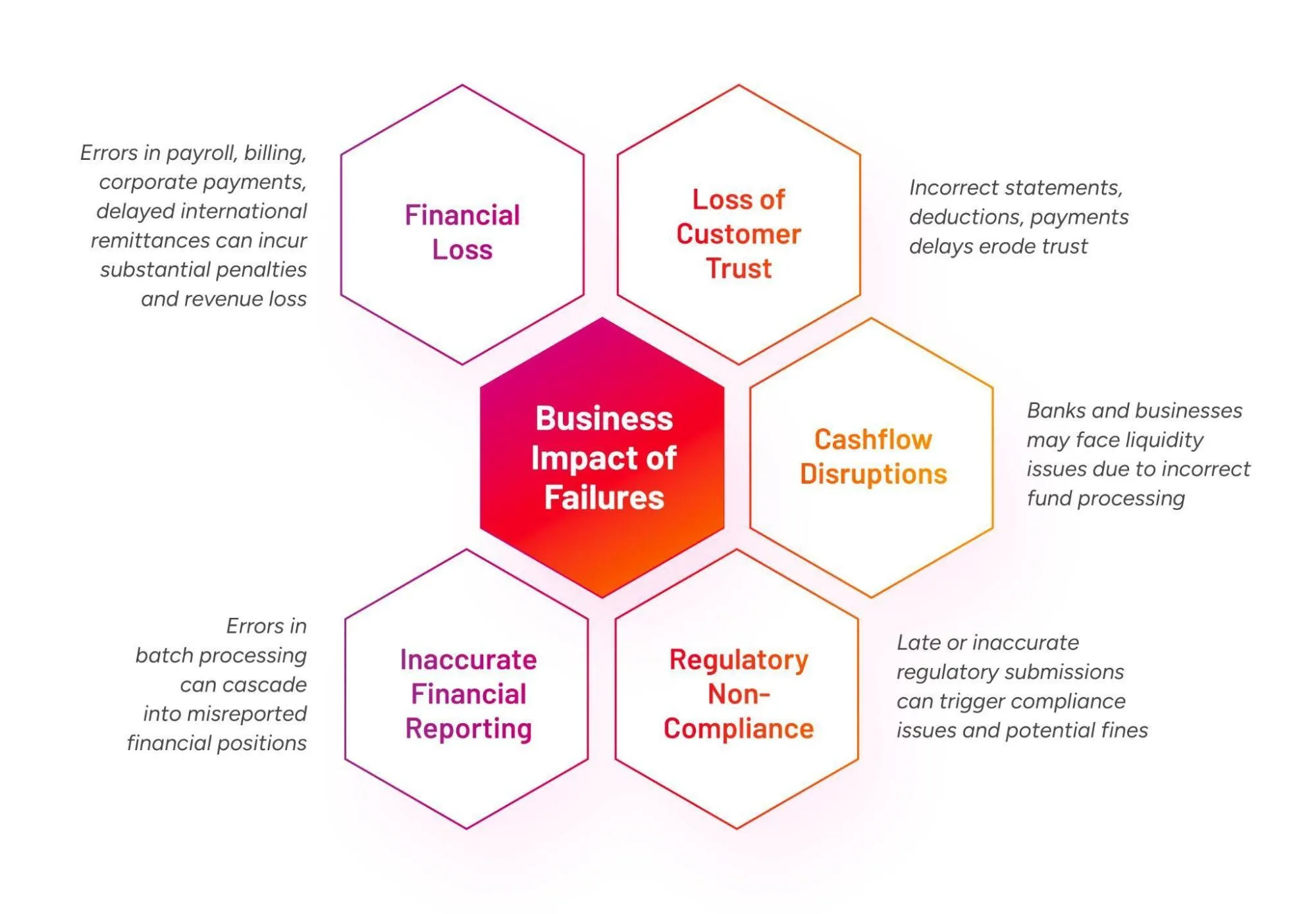 - Lack of Business Context: No visibility into regulatory deadlines, currency exchange constraints, and liquidity thresholds that banks navigate daily.