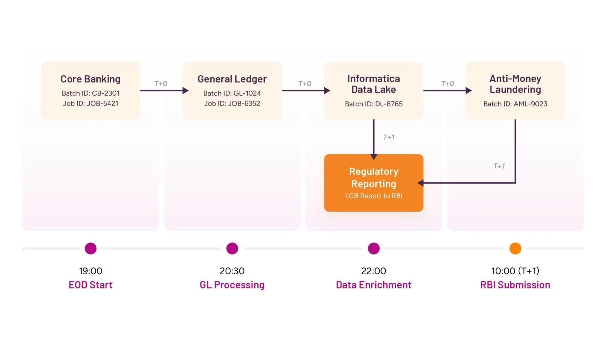 - Regulatory Compliance: The platform ensures the Bank’s batch jobs are compliant with regulatory requirements. For example, our platform can track the generation of LCR reports and ensure that they are submitted to the RBI on time.