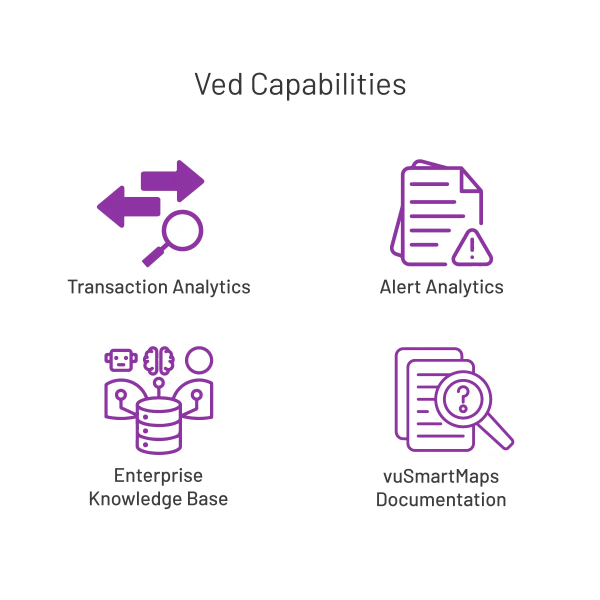 Whether you’re exploring the nuances of instant payment transactions, delving into alert analytics for system health monitoring, or seeking guidance on vuSmartMaps configurations, Ved is designed to simplify your footprint. Through simple conversational interactions, Ved streamlines complex analyses, making observability more accessible and intuitive than ever before.