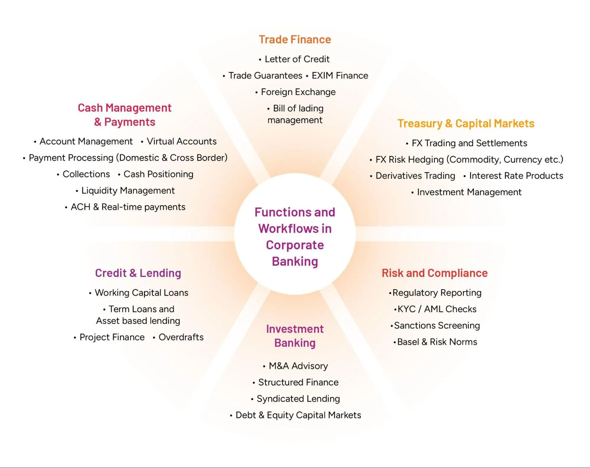 Most of the services cater to critical, time-sensitive, and high-value financial transaction flows in corporates. Here’s a quick overview of the typical functions and workflows in corporate banking: