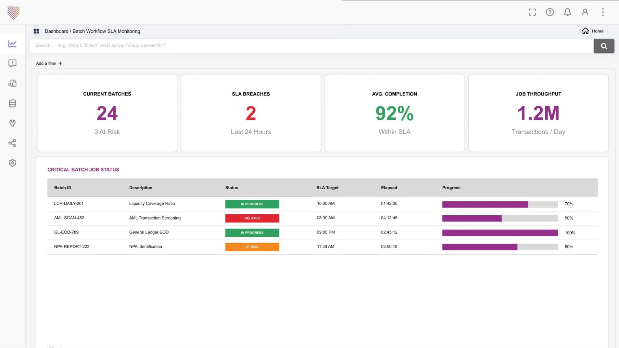 Ingest and correlate batch job logs to validate and enrich data. Map job dependencies to offer a complete view of transactions, helping detect and prevent downstream impact from delays or failures. Enable automated retries to reduce manual intervention.