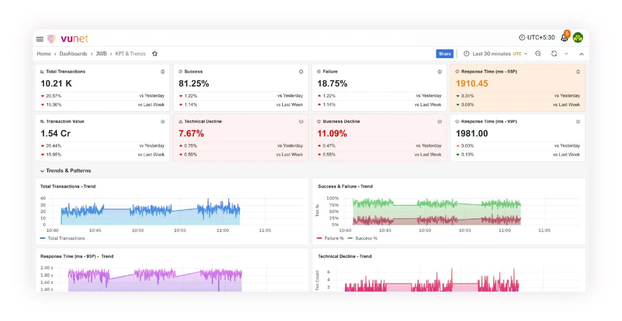 VuNet understands banking processes (such as customer onboarding, payments and settlements, KYC authorizations, EOD reconciliation, and regulatory reporting) and the complexities involved in these workflows spanning multiple systems and APIs, involving batch jobs, manual steps, and validations. We have built this domain knowledge into our platform, enabling real-time monitoring of critical operations.