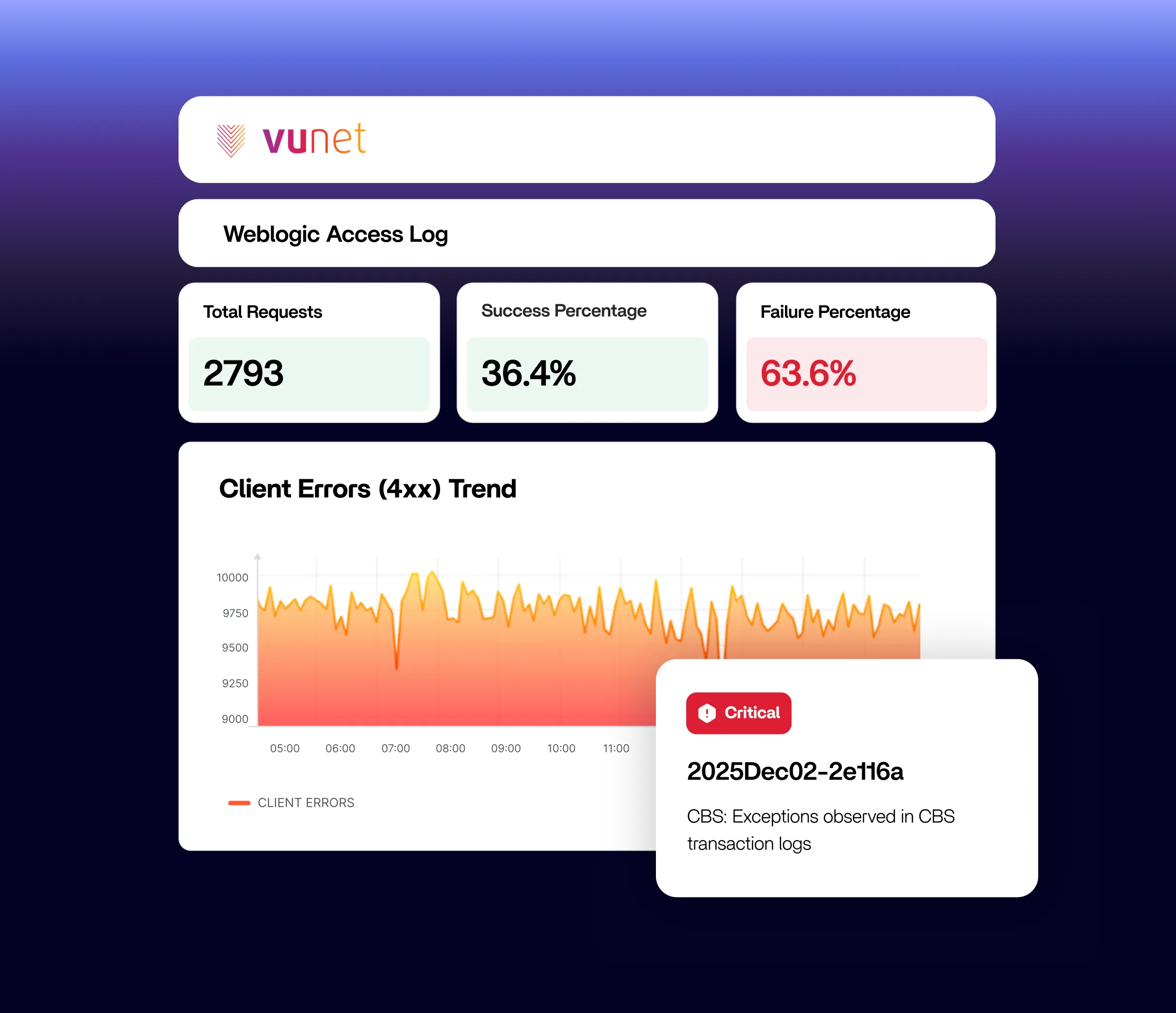 With vuLogX, transform billions of raw logs—from apps, APIs, middleware, and cloud—into real-time answers. Eliminate noise, leverage AI to surface the signals that matter, and resolve incidents in minutes, not hours.