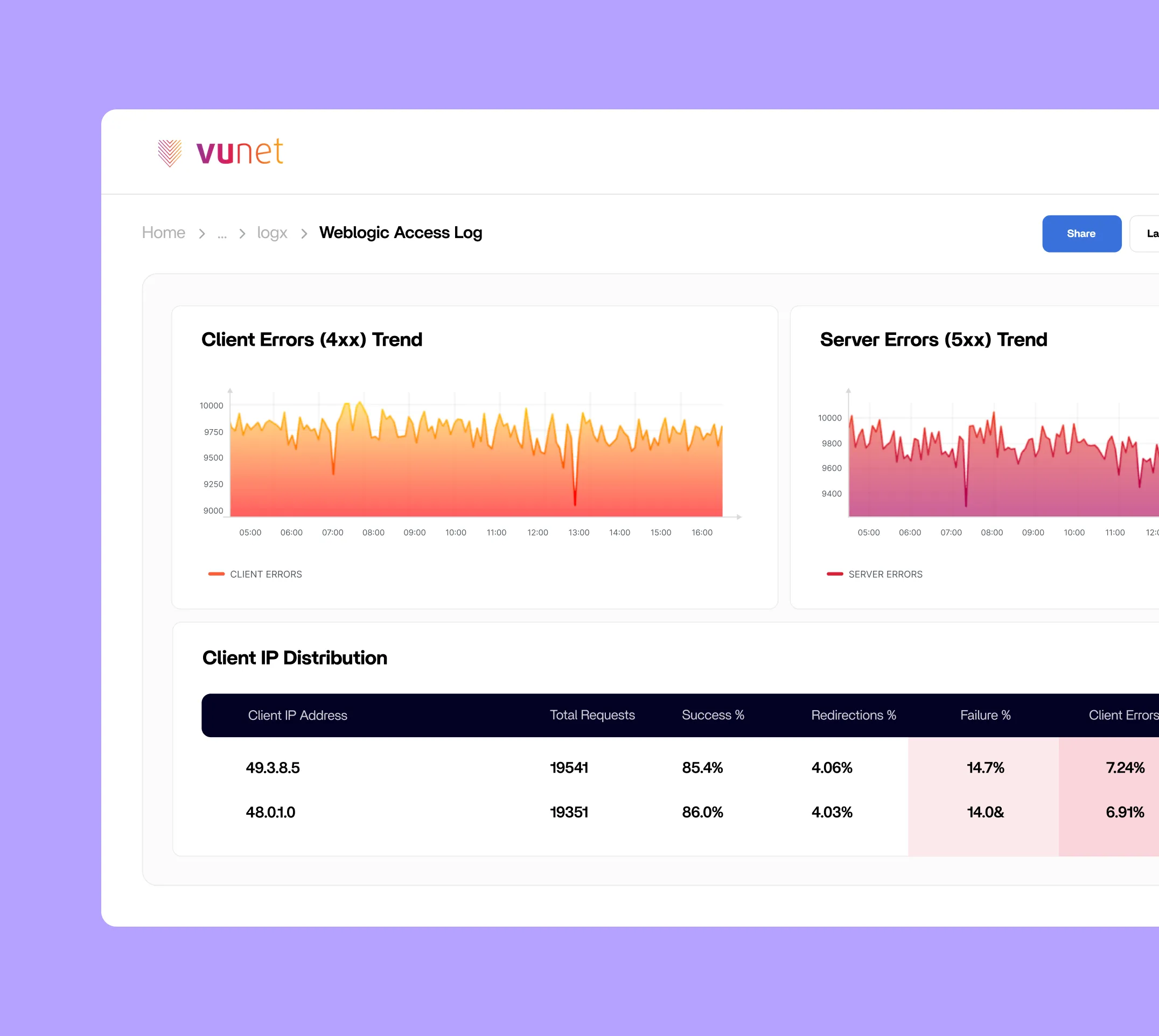 Store logs at petabyte scale with flexible retention and automated retrieval that meets SEBI, ISO, SOX, PCI, and HIPAA requirements. Fast and deep log querying with VQL (VuNet’s query language) delivers audit trails instantly.