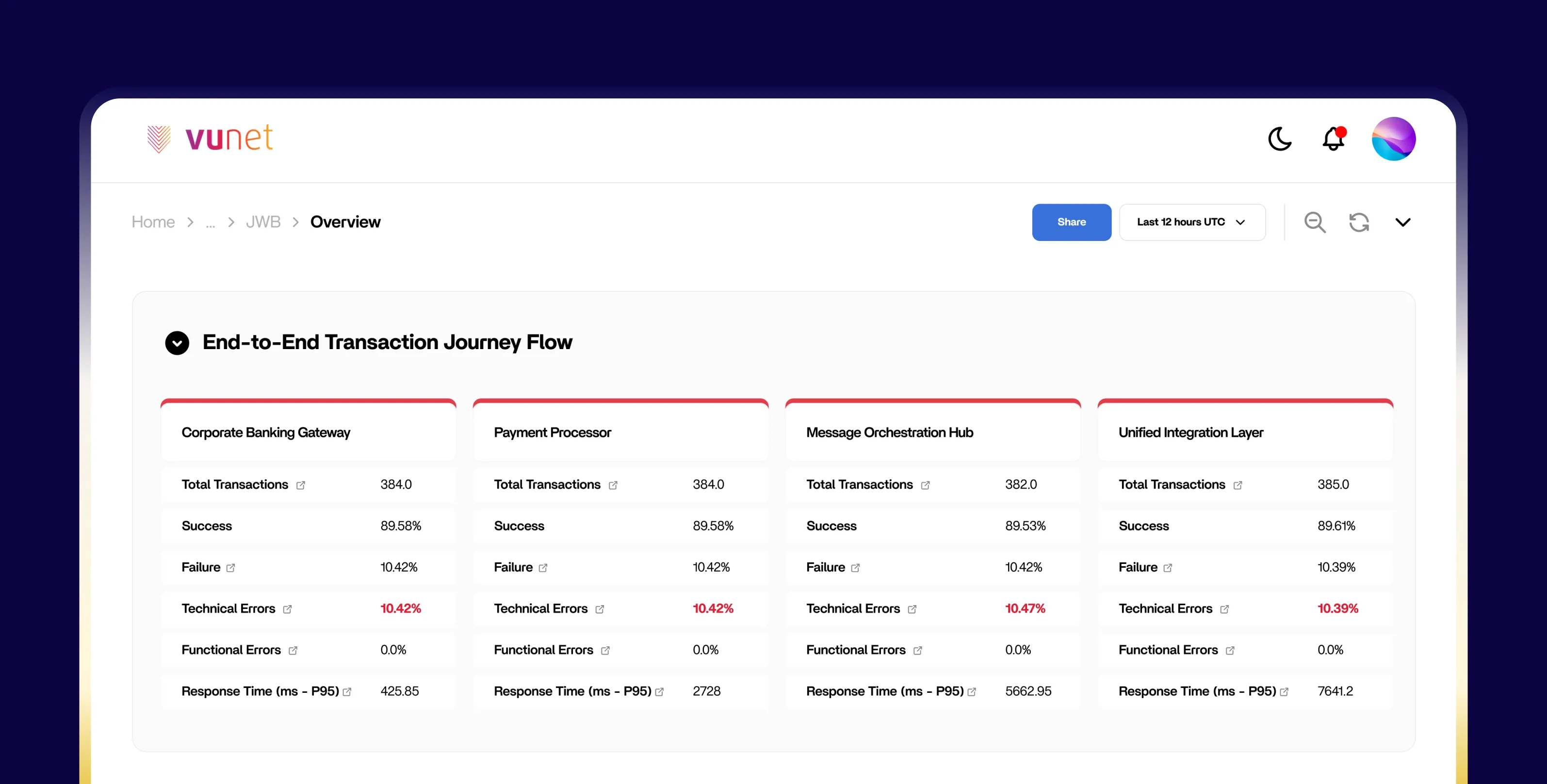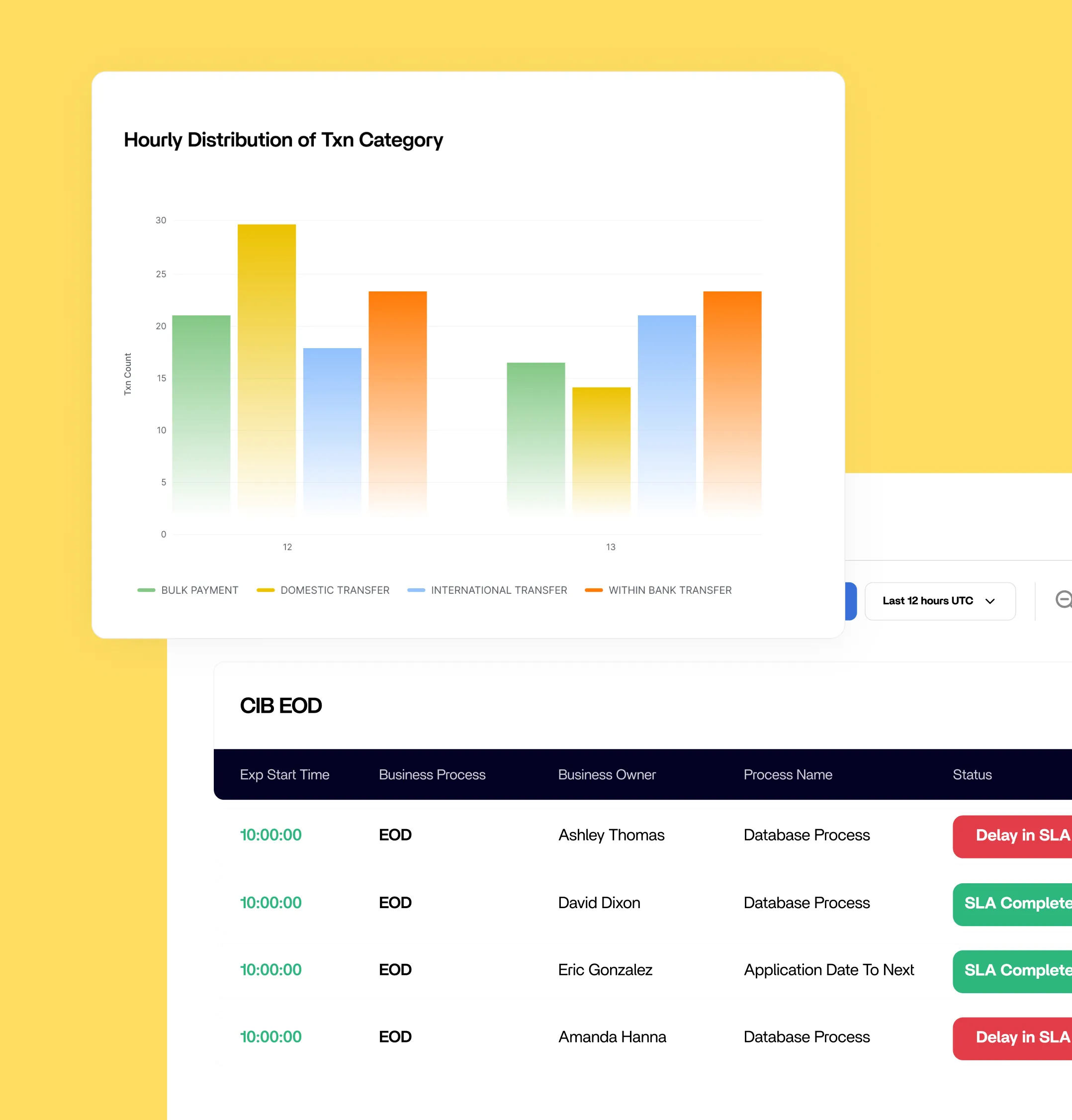 - See exactly where transactions flow or fail with full business context: client names, transaction IDs, SLA impact.